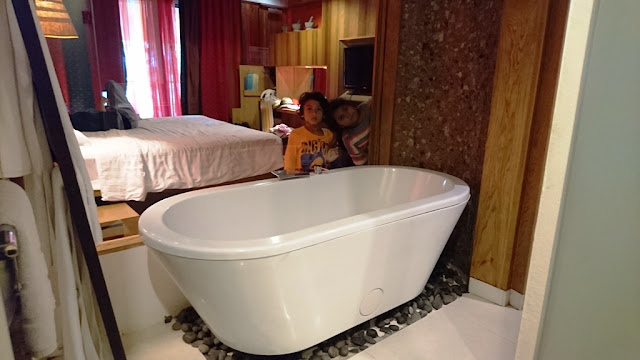 Kalau Lana dan Keano seneng sama kamar mandinya yang open space. Cuma dibatesin kaca sama kamar tidur. Udah gitu mereka memang selalu senang dapat kamar mandi yang bath tub. Maklum di rumah adanya cuma bak sama ember plastik hihihi… Konsep kamar mandi di tempat kita nginep ini memang bikin betah lama di dalemnya. Jadi salah satu tempat main duo Lana dan Keano selama kita di sini.