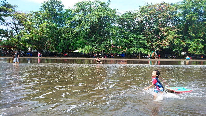 Berbeda dengan karakter pantai selatan lainnya, ombak di Batu Karas tidak datang dengan deras. Pantainya juga landai, miriplah sama Pantai Kuta Bali, tapi dengan skala yang lebih kecil. Kalau biasanya saya waswas melepas Lana dan Keano bermain air di kawasan pantai selatan, di sini justru tenang banget. Mungkin karena pantainya dikelilingi teluk. Dan yang paling meyenangkan, ombaknya nyaman banget buat berselancar serta bersih dari sampah. Lana dan Keano masing-masing asik bermain bodyboard. Sementara, keluar sedikit dari teluk keliatan bule-bule asik menunggu ombak untuk surfing beneran.
