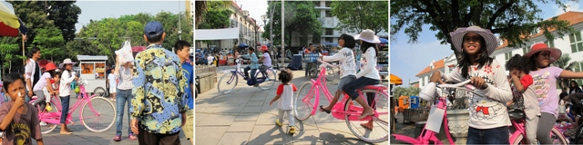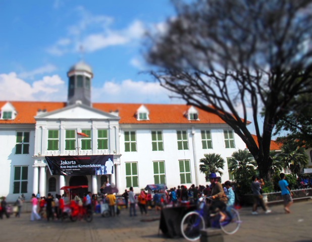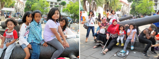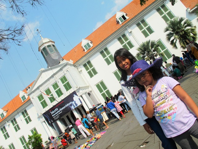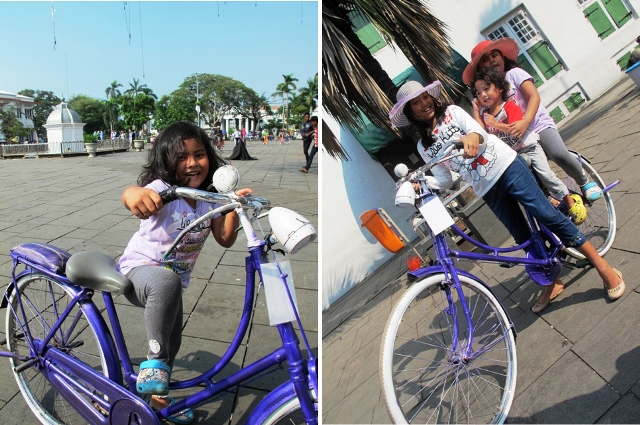 Kalau kami di sini lebih sering memilih untuk sekadar duduk-duduk dan bermain di alun-alun Kota Tua. Ke Museum Fatahillah misalnya cukup masuk sekali saja. Yang penting tahu dan hilang penasaran. Selebihnya kalau ke sini lagi, alun-alun atau lapangan Kota Tua jadi tujuan utama. Main sepeda misalnya. Sewa sepeda ontel lengkap dengan topi noni atau topi ala meneer Belanda.