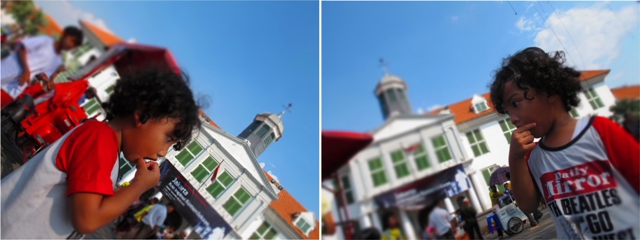 Di Kota Tua juga biasanya suka ada atraksi dadakan dari seniman-seniman jalanan atau bahkan pedagang nyentrik. Seperti tukang obat dengan atraksi ularnya. Sudah lama banget saya gak denger cuap-cuap dahsyat ala tukang obat. Jadi inget dulu sering iseng dengerin tukang obat di alun-alun kota Bandung. Orator ulung, gak kalah sama jauh lebih menarik dari pada pidato politikus pas kampanye pemilu. Di lapangan Kota Tua, ada juga memang yang jualan atraksi buat nyari duit, kaya ‘debus-debusan’ dan jaranan atau kuda lumping. Sempat nongkrong sama Lana dan Keano lihatin mereka semua main pecut-pecutan dan sembur-semburan api.