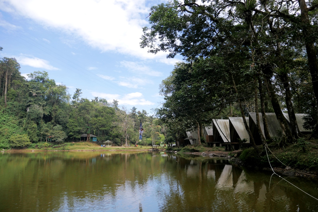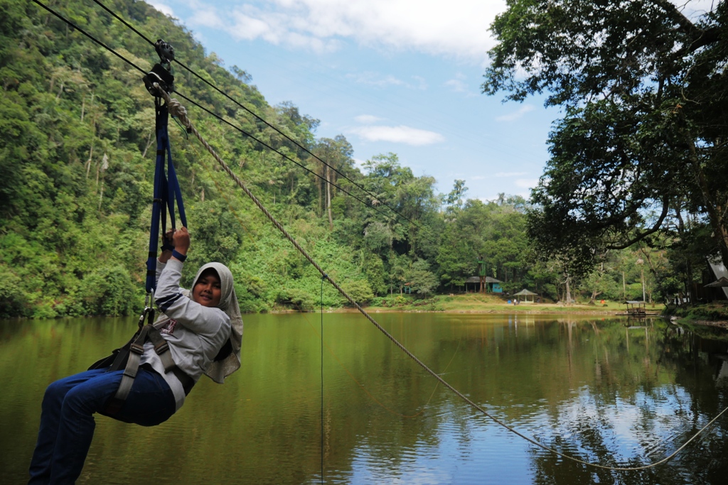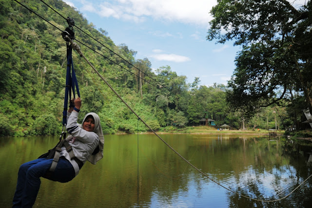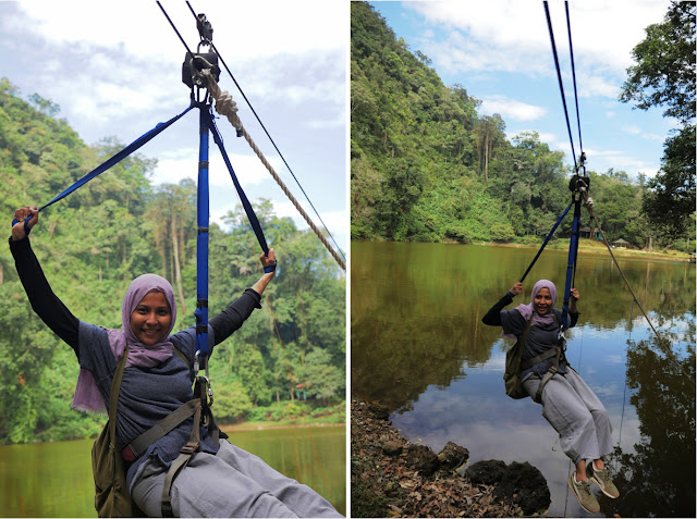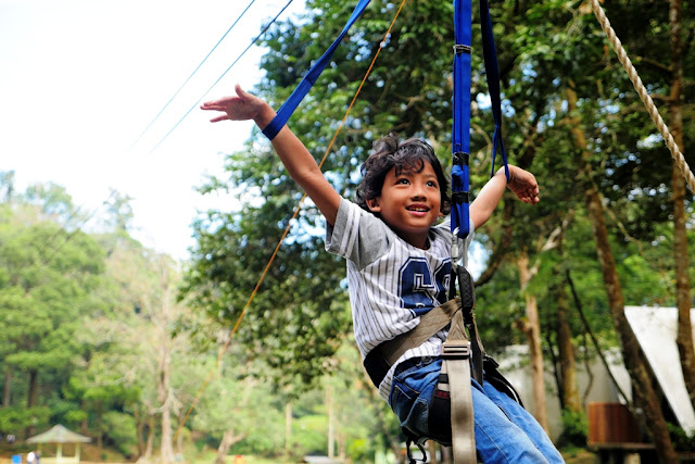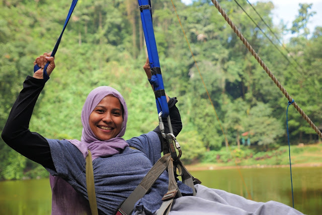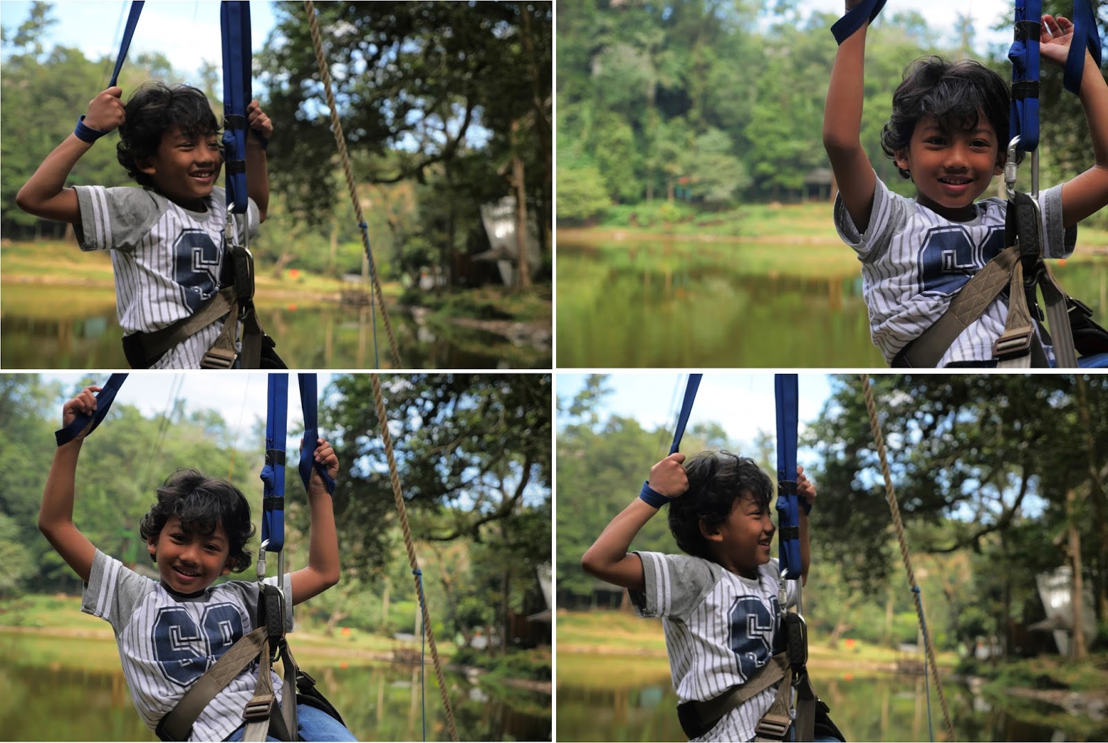 Yang mau coba flying fox juga bisa. Lumayan tinggi, dan panjang jalurnya melintasi danau. Tadinya saya cuma mau temenin Lana dan Keano sampai di atas menara sebelum naik flying fox. Tapi.. tergoda juga untuk meluncur.