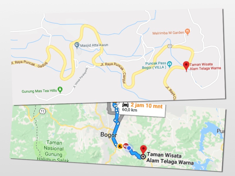 Posisinya pas menjelang Puncak Pass. Kalau dari arah Jakarta, jalan masuknya ada di sebelah kiri sebelum resto legendaris Rindu Alam (yang udah di bongkar). Dari Depok tempat kami tinggal, jaraknya sekitar 60 kilometer.