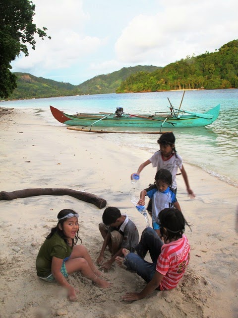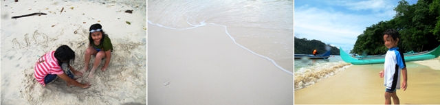 Setelah menyimpan semua barang di kamar, anak-anak langsung lari ke pantai dan nyebur ke laut. Sudah diprediksi bagaimana senangnya mereka. Apalagi dengan pasir putihnya yang halus dan bersih dari batuan tajam, juga sampah, membuat kami gak khawatir meninggalkan anak-anak main di pantai. Hanya ada sedikit daun-daunan (kalo bisa dibilang) mengotori air laut yang jernih berwarna biru gradasi tosca. Sore itu gak ada pengunjung lain di pulau atau pantainya. Serasa pemilik pulau, kami menikmati dengan tenang; berenang, main pasir, snorkling, hingga jalan-jalan menyusuri garis pantai.