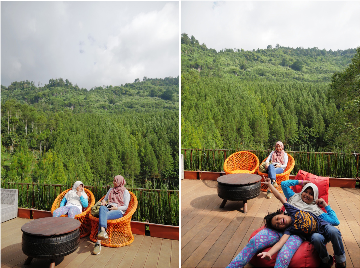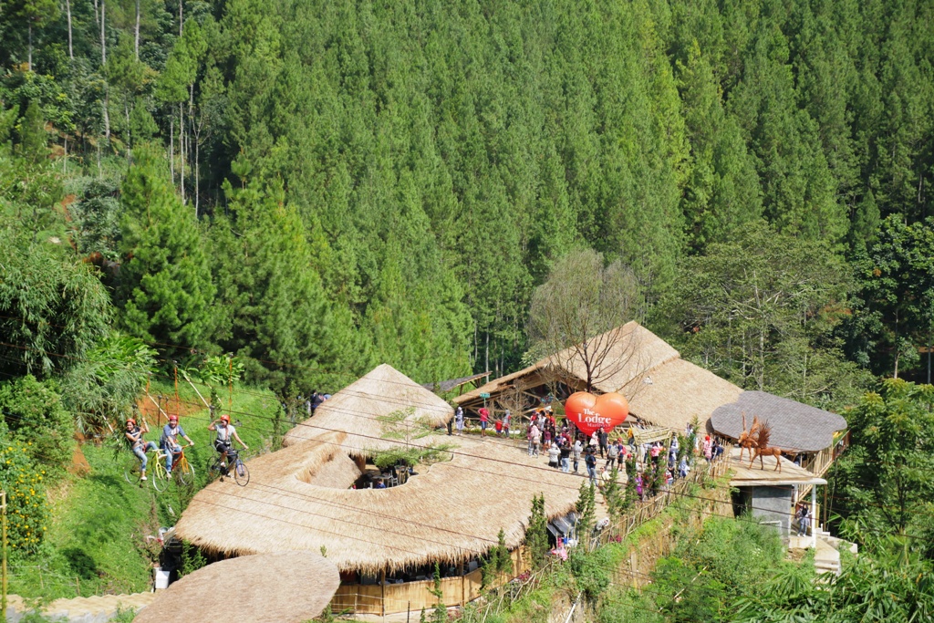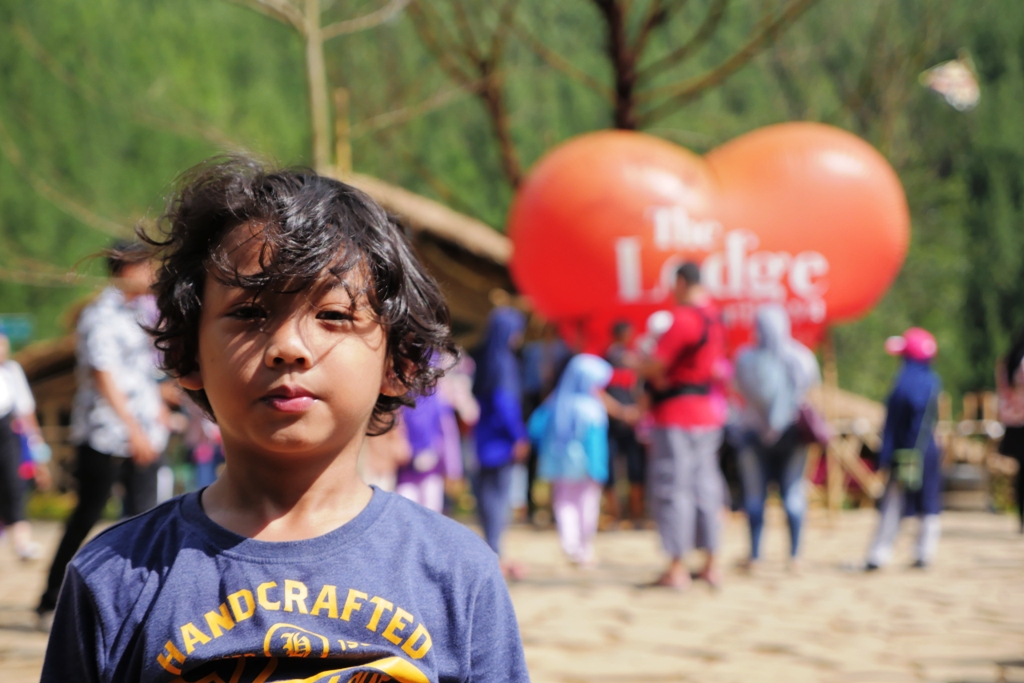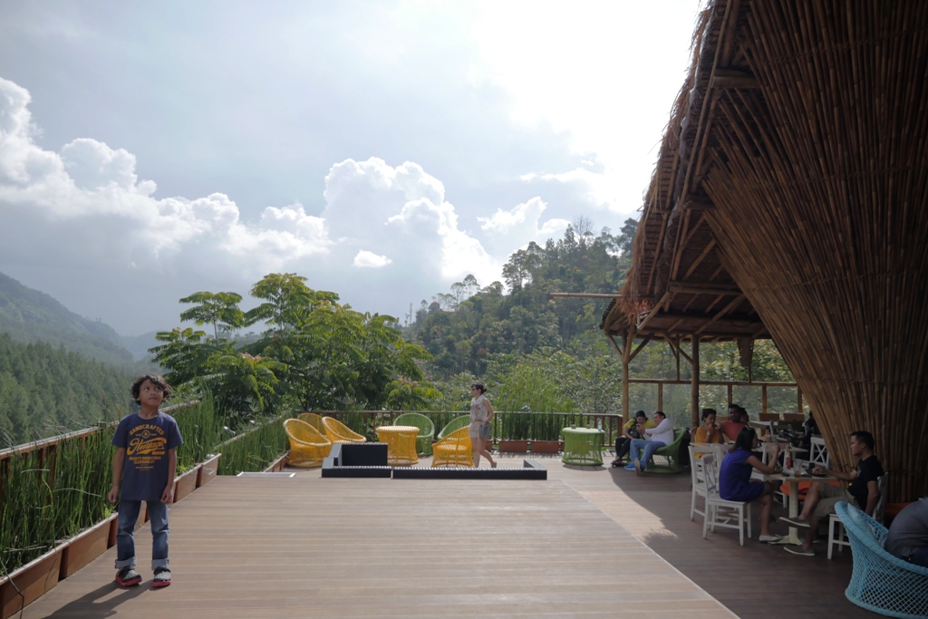Di dalam Omah Bambu Resto, tetep ada spot bagus mengambil gambar. Jadi, abis makan jangan cepet-cepet keluar. Rugi. Nyantai aja dulu di terasnya. Meja makan boleh kita tinggal buat pengunjung lain yang udah kelaperan. Soalnya, masuk ke seluruh lokasi The Lodge gak boleh bawa makanan dan minuman dari luar. Makanya selain Omah bambu, ada satu cafe lain dan foodstall juga yang menyediakan beragam makanan dan minuman. Untuk foodstall tersedia lumayan banyak dengan beragam pilihan makanan untuk ganjel perut. Btw, tiket masuk yang kita bayarkan juga sebenernya bisa ditukar dengan minuman gratis. Tapi, minuman gratis ini adanya deket pintu keluar. Jadi agak males kan bolak balik untuk ambil minum doang. Apalagi, lokasi konturnya berbukit yang mengharuskan kita berjalan turun naik.