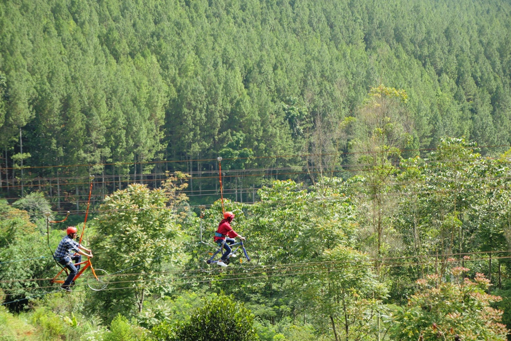 Contohnya, sering liat kan di instagram, berfoto diatas sepeda yang meluncur diatas seutas tali. Hasilnya keren ya??? Prosesnya? lumayan bikin senyum-senyum sih. Para pengunjung yang sudah membayar (lagi) untuk difoto, antre panjang. Catet ya, waktu kami ke sana pas hari libur soalnya. Antrean mau foto beginian udah kayak ular. Pas udah gilirannya, pengunjung dipasang pengaman, naik ke sepeda, kemudian ditarik ke tengah oleh petugasnya. Photografer lalu teriak mengarahkan gaya. Harus teriak bukan karena galak. Tapi, lokasi tukang fotonya emang rada jauh. Setelah 3 atau 4 kali pose, cepet-cepet sepeda ditarik lagi, ganti deh sama pengunjung lain. Proses foto ini, cuma sekitar 1 menit. Lebih lama antrenya. Petugas dan tukang fotonya udah bener-bener fasih melayani pengunjung. Semua berlangsung taktis dan cepat banget.