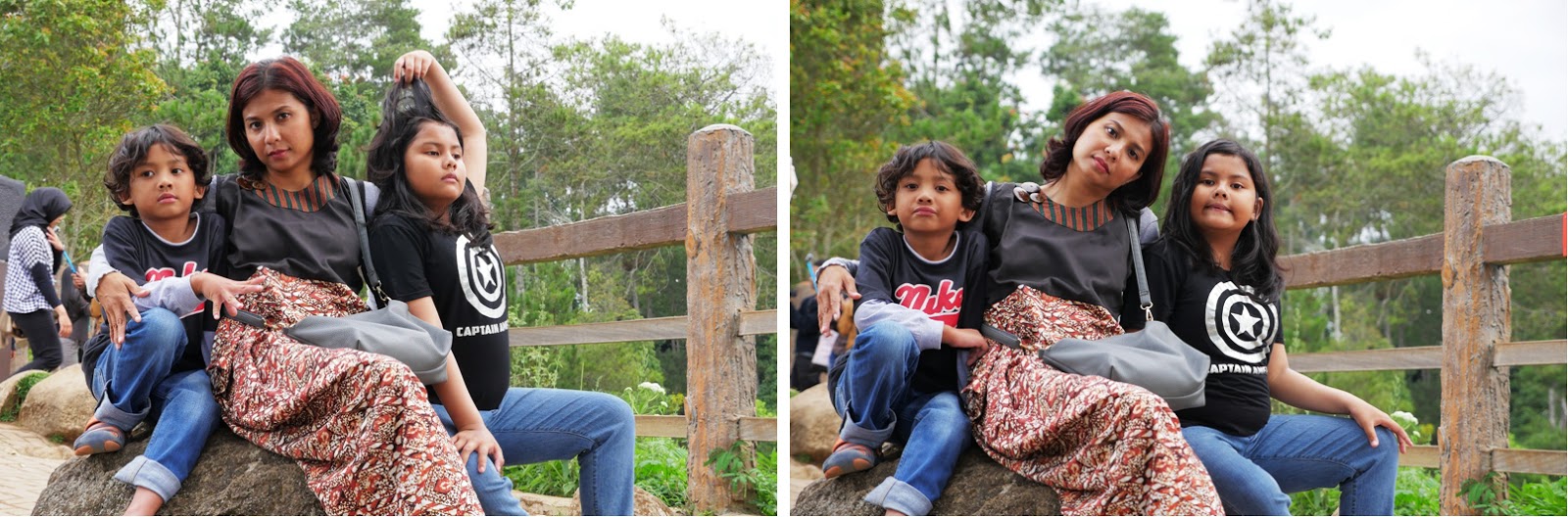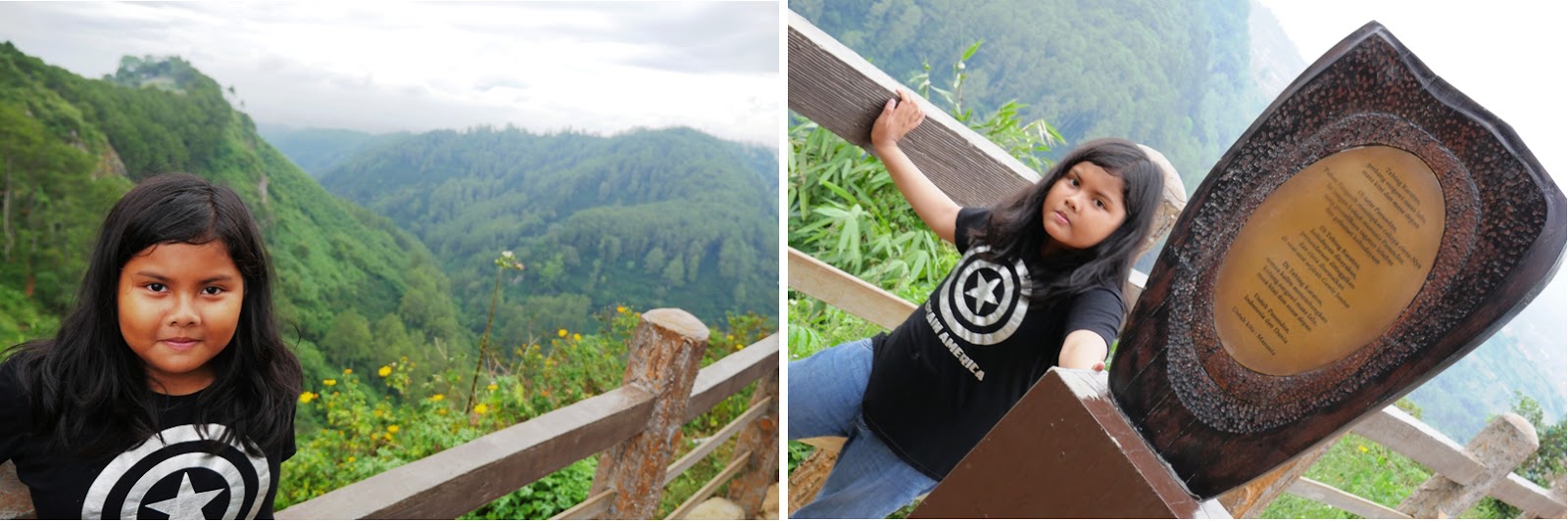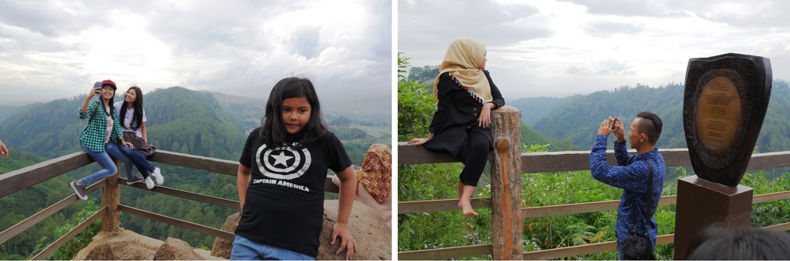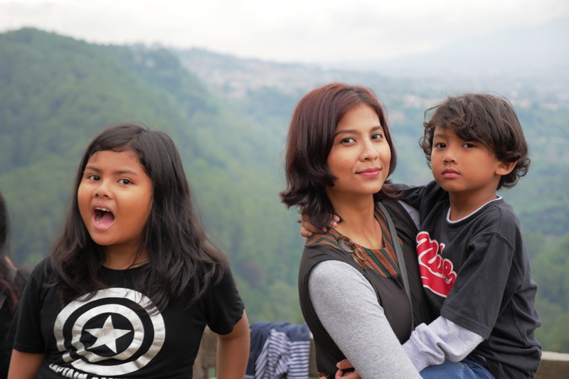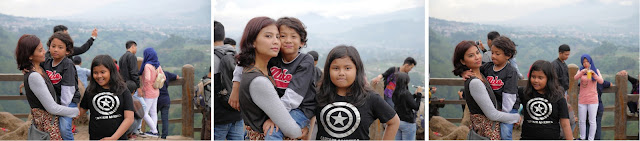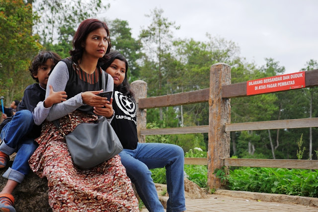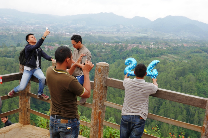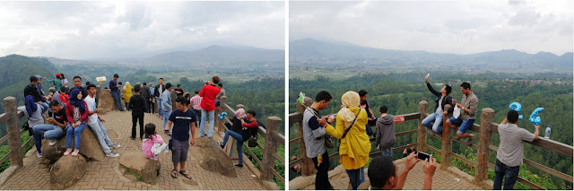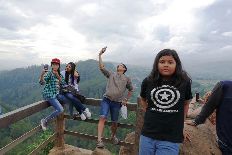 Pas sampai di Tebing Keraton, Lana agak bingung dan sempat nanya mau ngapain di sini. Mungkin bingung karena tempatnya cuma taman yang gak terlalu besar dan juga banyak orang lagi sibuk berfoto ria. Dengan tongsis ataupun tanpa tongsis. Mungkin di pikirannya, perjuangan jalan kaki menanjak sekitar 3 km dengan kaki yang sakit, gak sebanding dengan ekspektasinya. Gak ada wahana permainan misalnya. Hehe maaf ya Mbak Lana… Ya akhirnya kami cuma duduk-duduk jadi pengamat, dan sesekali ikut fotoin Lana, sambil nunggu Keano dan emaknya datang.